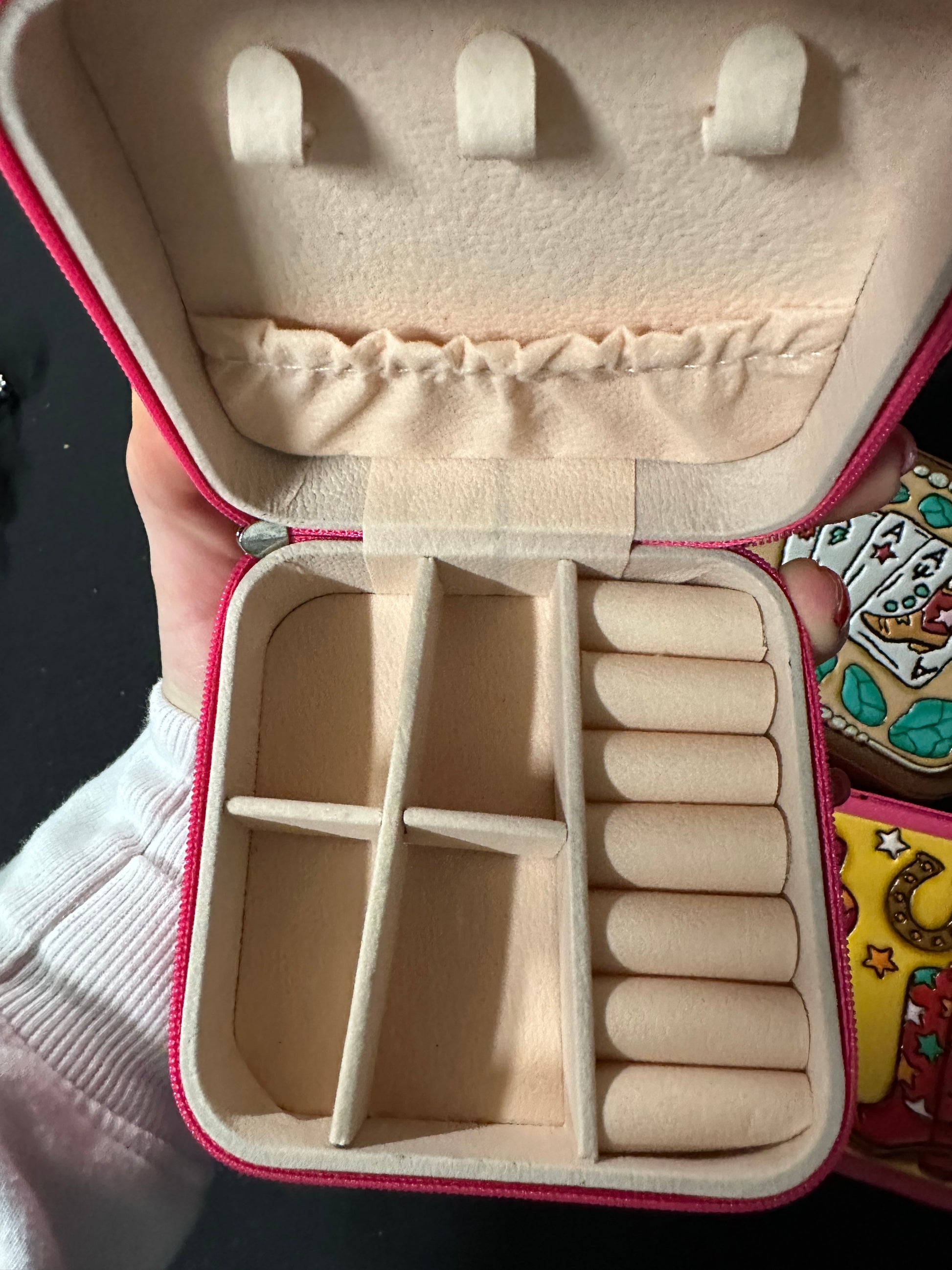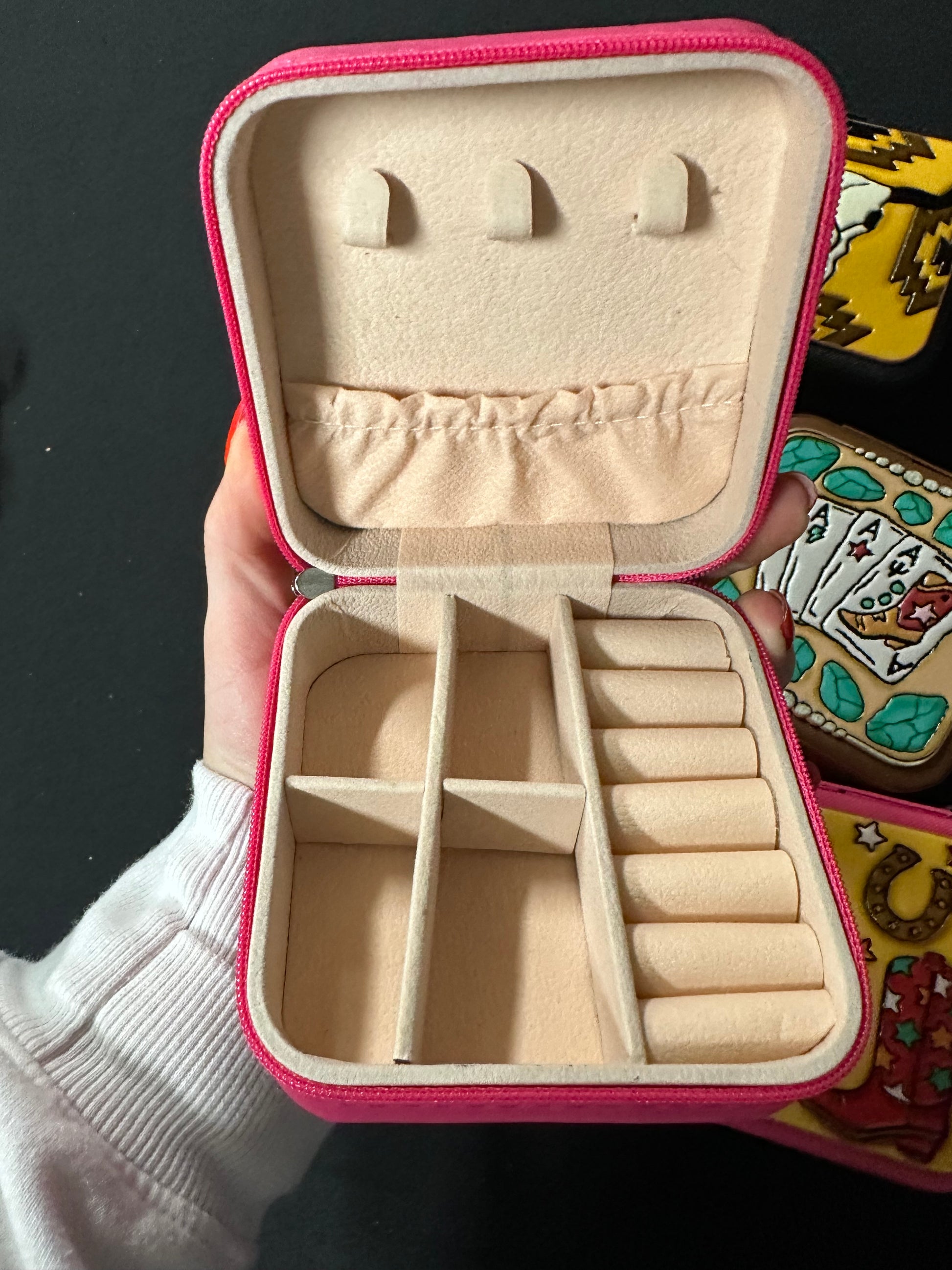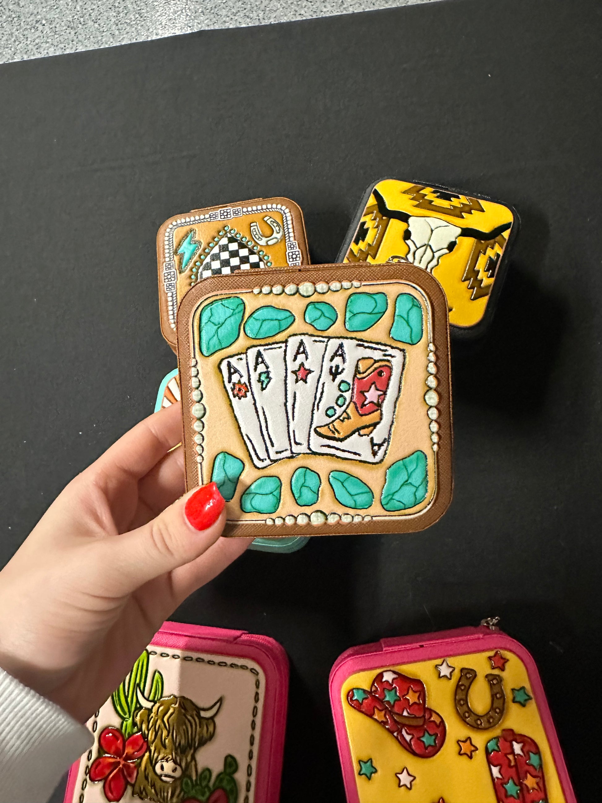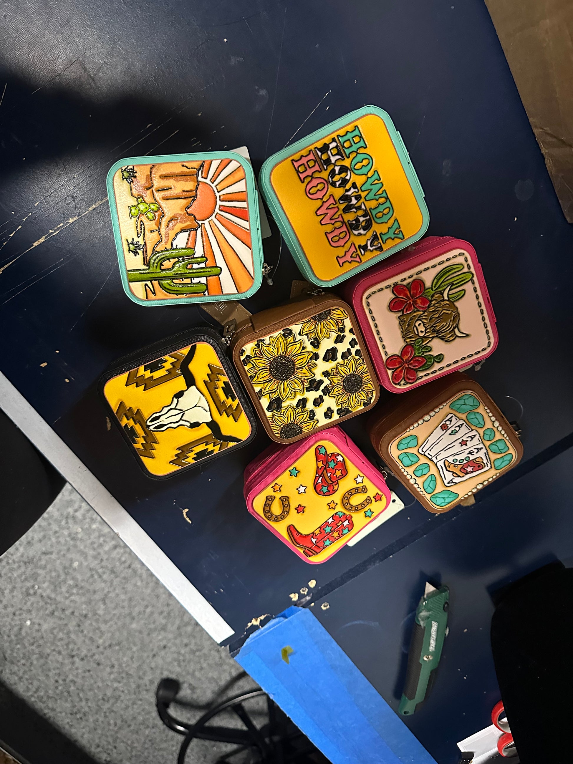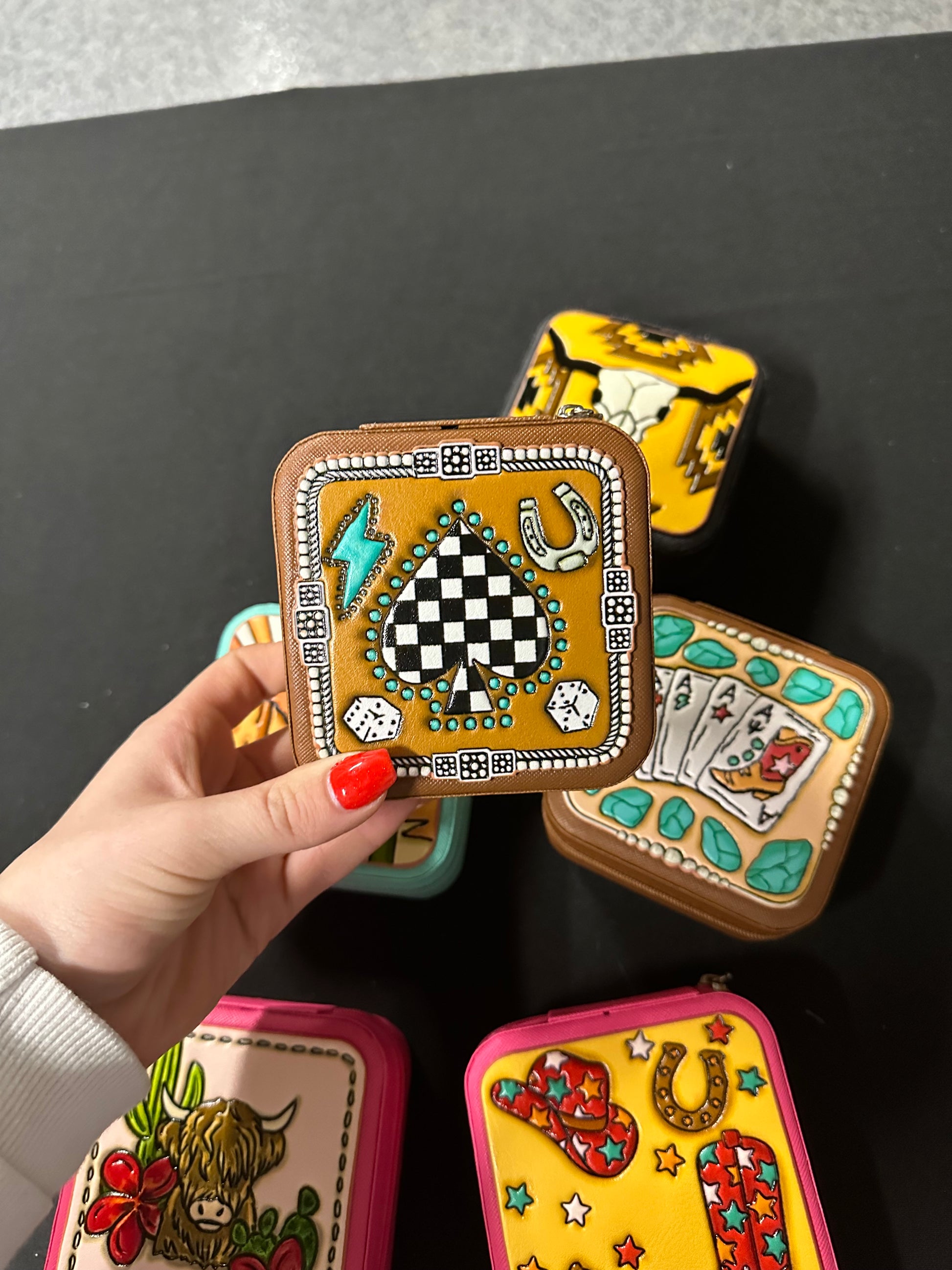 This Western tooled leather travel jewelry box is a stylish and practical solution for storing your valuables while on the go. Crafted from high-quality leather, it features intricate tooled detailing and a spacious interior for all your jewelry essentials. Keep your treasures safe and organized with this must-have travel accessory.